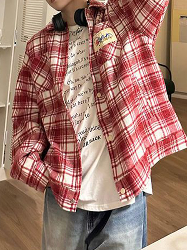 Blusa de manga larga bordada con estampado de cuadros vintage para hombre