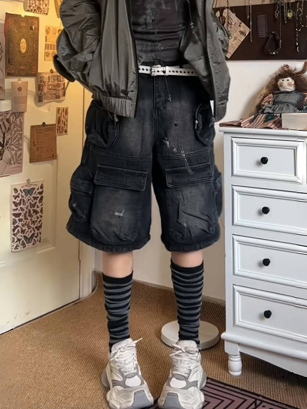 Pantalones cortos de mezclilla lavados con múltiples bolsillos