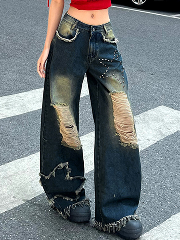 Vaqueros rotos con pedrería de estrella degradada y borde sin rematar