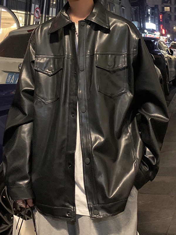 Chaqueta de moto de cuero con cuello de solapa y bolsillo con solapa vintage para hombre