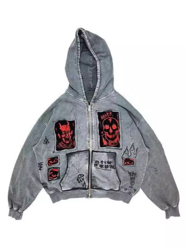 Sudadera con capucha extragrande con estampado de calavera desgastada Hip Pop para hombre
