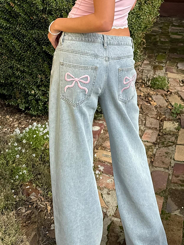 Vaqueros boyfriend con lazo rosa y bolsillo trasero bordado