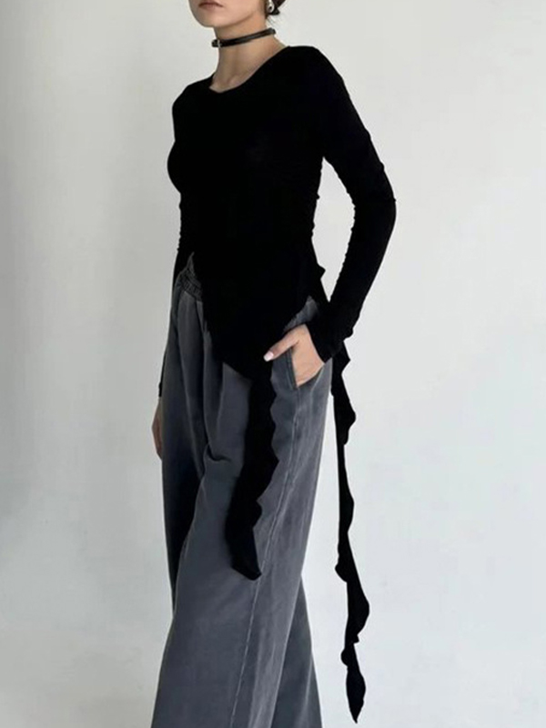 Camiseta de manga larga con volantes de color liso