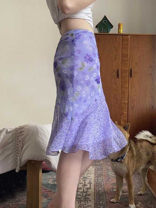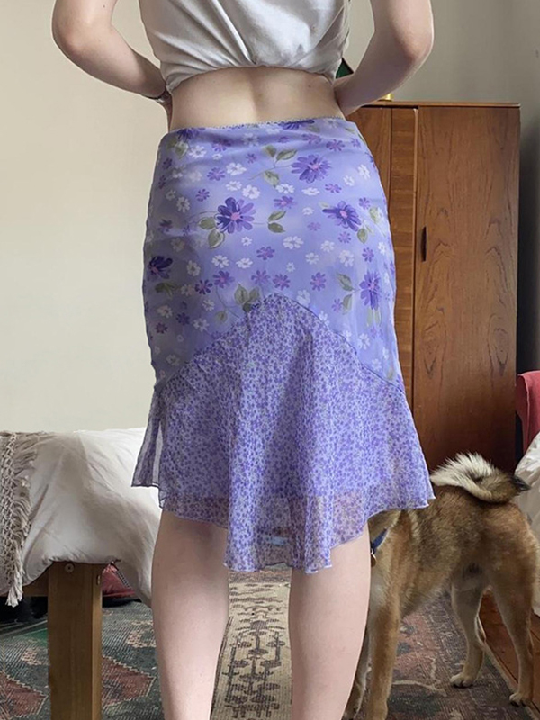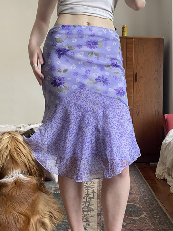 Sé el primero en valorar “Falda larga irregular con patchwork floral morado”